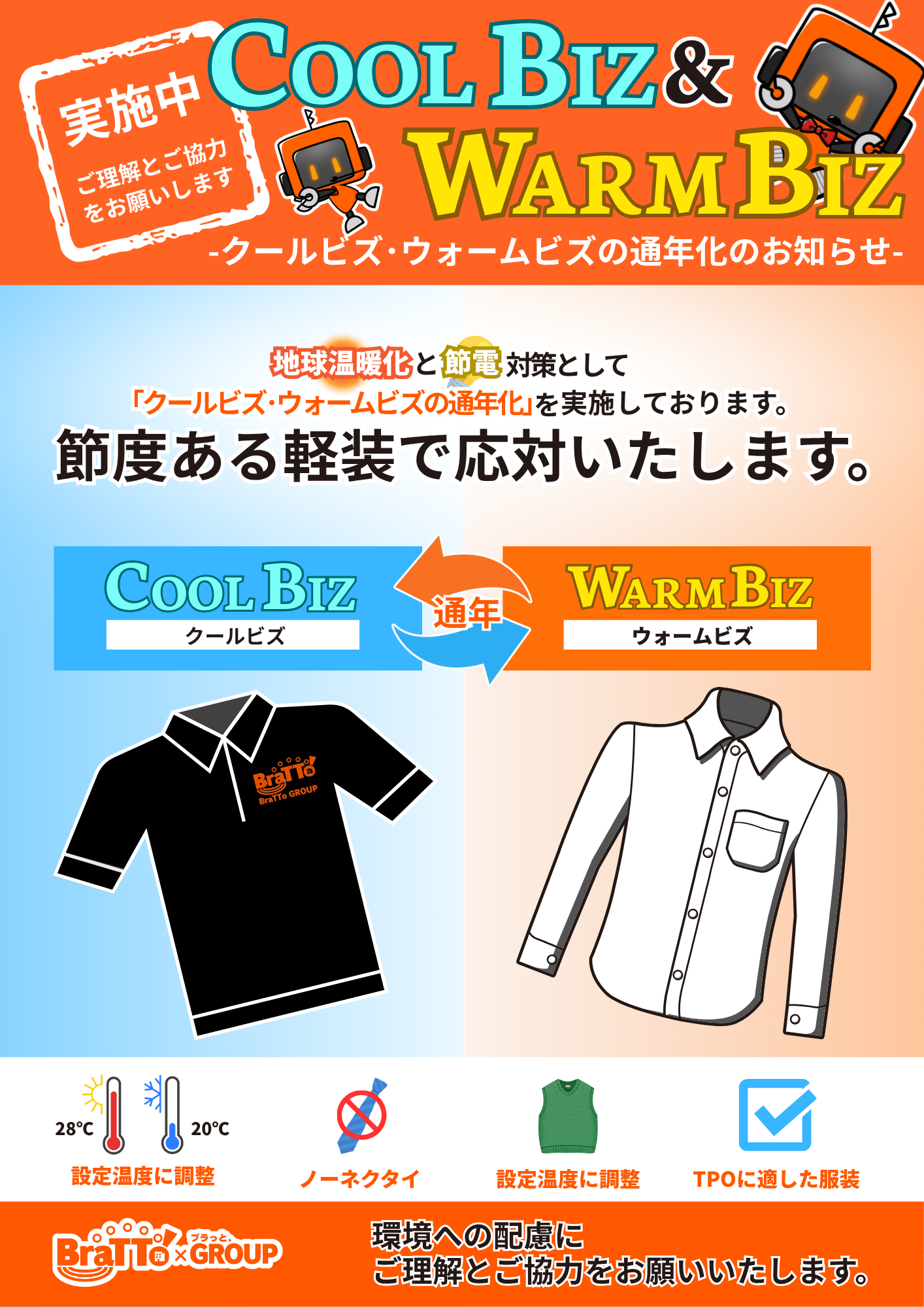 これまで夏季に「クールビズ」、冬季に「ウォームビズ」を実施してまいりました。